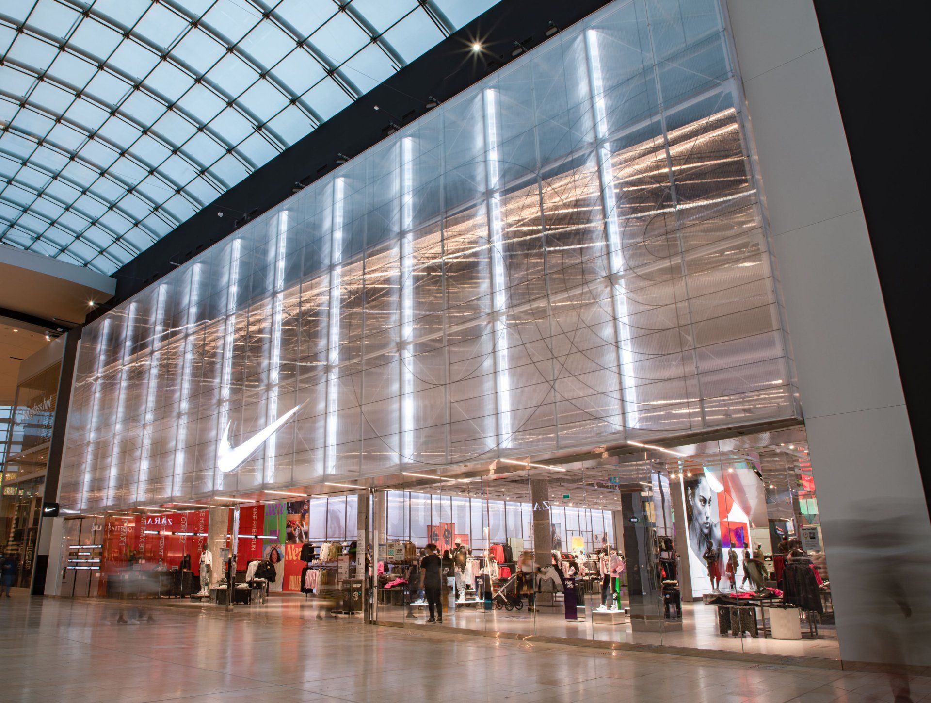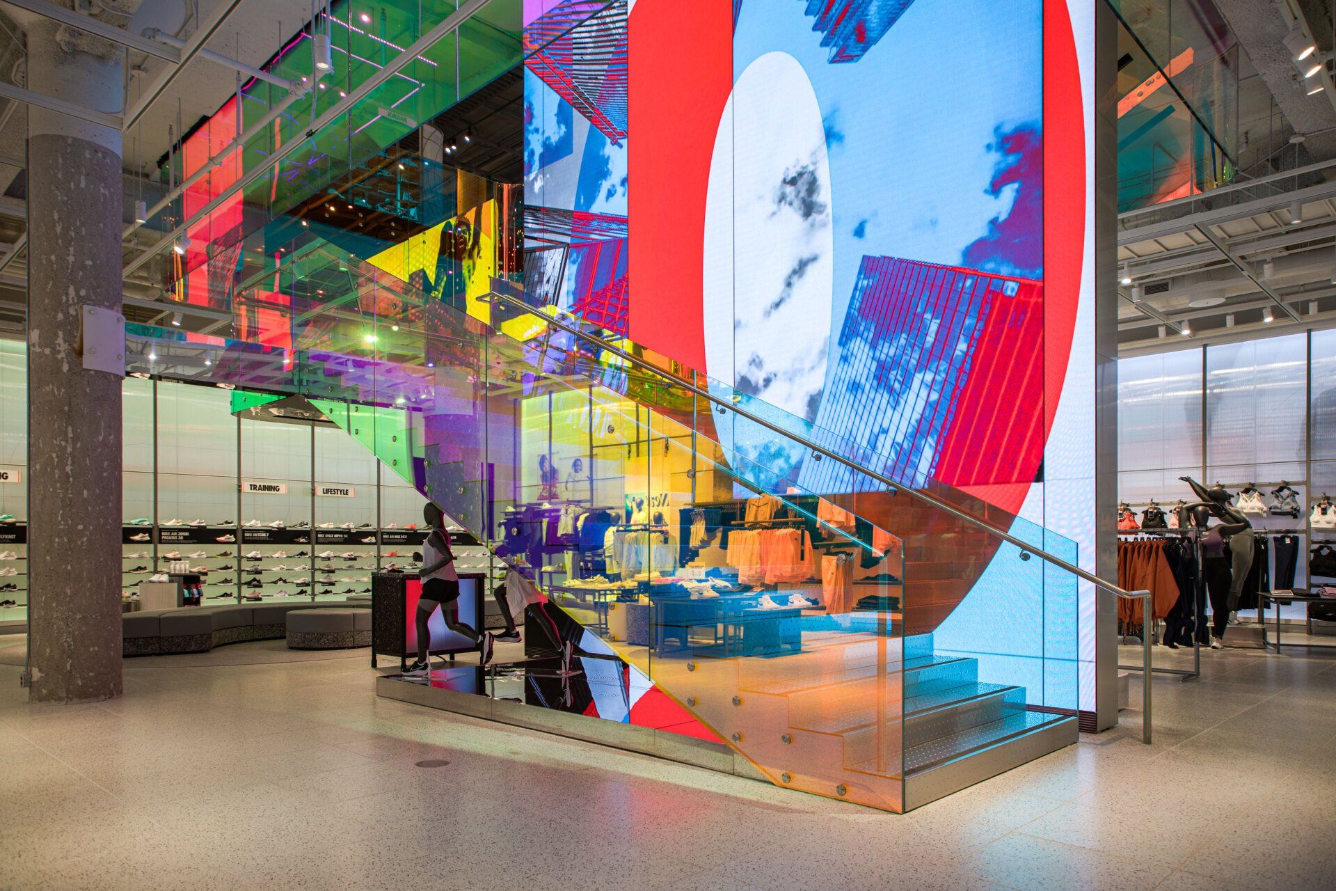 kraftwerk joined an all-star team of designers and architects on a journey from inspired ideation to the creation and installation of massive yet airy glass-and-steel elements crafted to immerse consumers into a Nike experience. The façade of Nike’s new Canadian flagship store featured 2,000 square feet of digitally printed, fluted panels suspended by just 36 connections to the base building; the store’s staircase—suspended from the interior slab assemblies—creates an oversized form that appears to float off the floor.